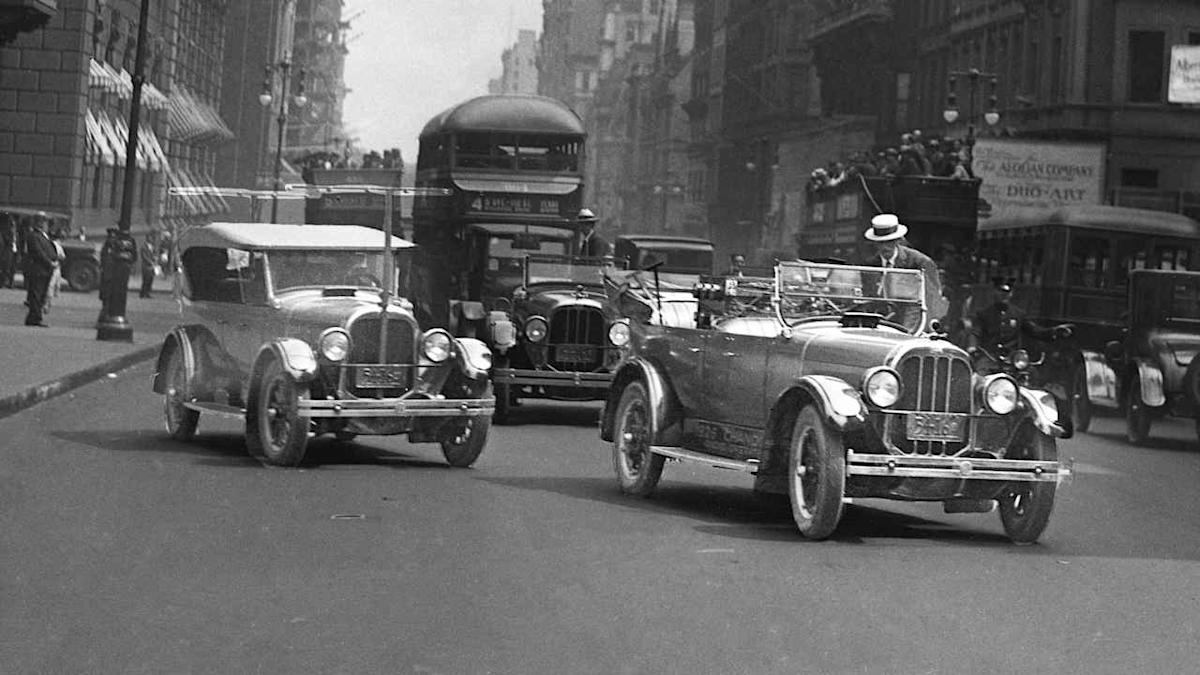 Čovjek stoji pokraj samovozećeg automobila na prometnoj ulici New Yorka 1925