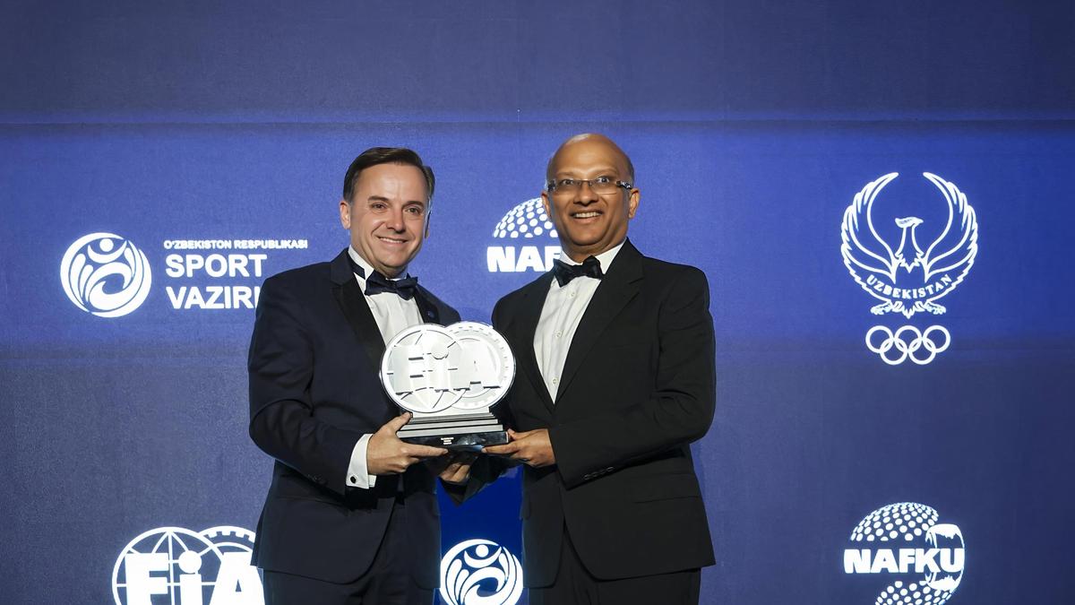 (lijevo) Manuel Avino, potpredsjednik, FIA Europe, predaje trofej ERC timskog prvenstva 2025. Arunu Mammenu, potpredsjedniku i upravnom direktoru, MRF Ltd na svečanoj dodjeli nagrada FIA-e.